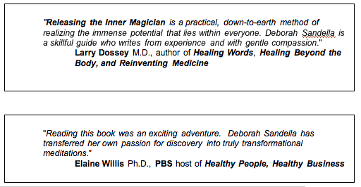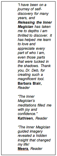 You can order Releasing the Inner Magician and the corresponding Guided Meditation CD for only $19.95, plus shipping. That’s less than the cost of a haircut, and certainly far less than the hundreds or thousands of dollars you would have to spend in a therapist's office or during a spiritual renewal retreat! |